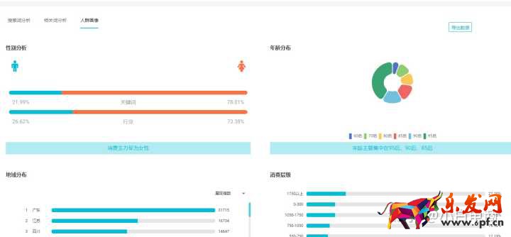還有相符的人群畫像更清晰分辨該詞下的人群、性別、年齡、地域分布、人群組合、消費層級