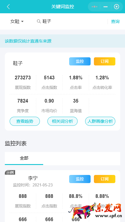 點擊關鍵詞監控,可以查詢任意關鍵詞的展現指數、點擊指數、點擊率、轉化率、競爭度等詳細數據,并且能查詢到這個關鍵詞下的相關搜索詞,方便我們拓展關鍵詞去優化標題和投放直通車。
