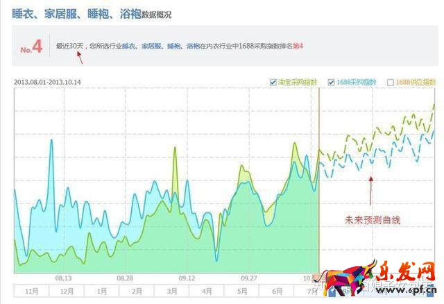 這里是行業大盤,選擇相應的類目后就可以看到。可以看到這個行業8月底就開始活躍了。因為淘寶采購指數上升,后面沒有填充顏色的部分是對未來的預測。那么,要做的得趕緊。。現在可能已經慢人家一步了。依然注意看統計時間。