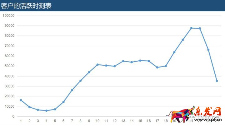 3、客戶每天的活躍時間段分布情況,并根據數據表現給業務部門提出有效信息。