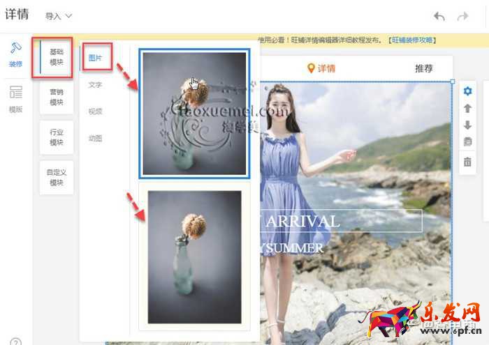 3、要實現(xiàn)一張圖多個鏈接,先添加一張圖片,然后加上多個熱點鏈接,具體操作如下,點擊左側(cè)欄上的【基礎(chǔ)模塊】,展開的項目中,點擊【圖片】,默認(rèn)有兩種樣式,選擇一個喜歡的樣式即可,