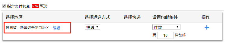 這里可以在前面設置不包郵的地區的基礎上設定一些包郵的條件。比如小編這里設置的就是甘肅、新疆兩地滿10件包郵。具體的設置可以按照店鋪的情況選擇是按照件數、金額還是件數+金額的條件進行包郵。