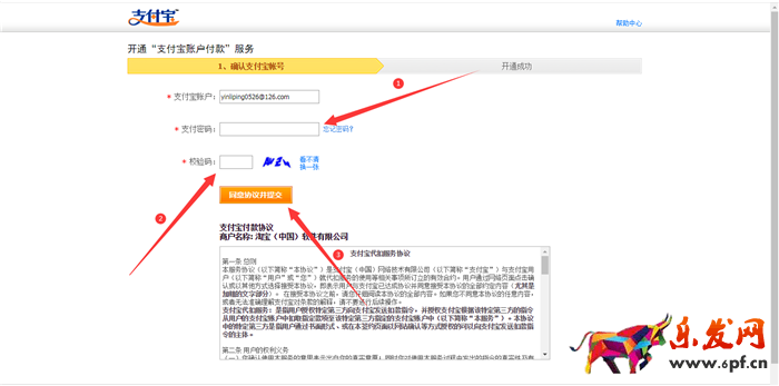 6.在這里我們輸入你的支付密碼。這個密碼是支付寶的支付密碼。不是登錄密碼,然后填寫上校驗碼,最后點擊同意協議并提交。
