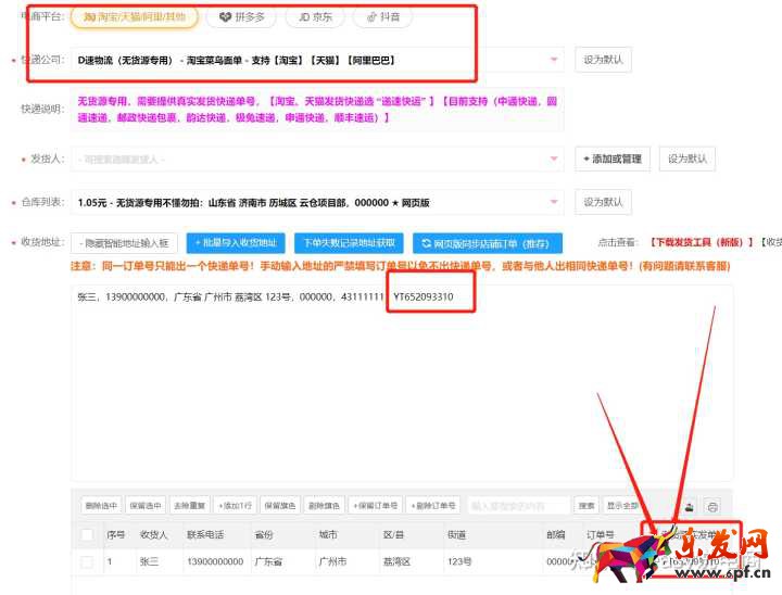 示例:張三,13900000000.廣東省 廣州市 荔灣區 123號,000000.43111111.YT652093310(YT652093310就是上家的物流單號)