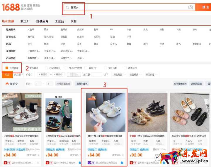 比如你想賣(mài)女孩穿的童鞋,你就可以直接在1688搜索“童鞋女”,然后勾選實(shí)力商家,再在搜索結(jié)果頁(yè)選擇你想代銷(xiāo)的款式,如下圖