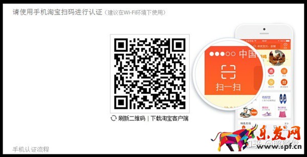 第三步:請通過手機淘寶客戶端"掃一掃"功能掃描二維碼;若未下載【手機淘寶】客戶端,請點擊二維碼圖中的"下載淘寶客戶端"進行下載,下載安裝完成后使用【手機淘寶】客戶端中的掃碼功能進行認證。
