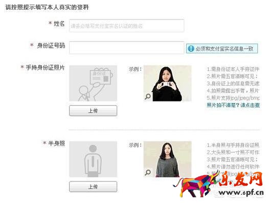 4、進入下一步后會看到如下圖這樣的頁面,請務必嚴格按照淘寶的認證規則填寫上傳姓名、身份證號、手持身份證的照片、半身照。