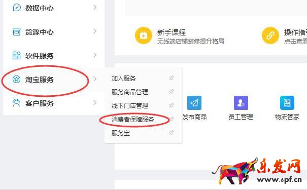2. 在淘寶賣家中心的界面里面,我們也會看到旁邊有一個菜單欄,在這個菜單欄里面找到“淘寶服務”這樣的一個模塊,然后點擊該模塊里面的“消費者保障服務”這樣的一個功能。