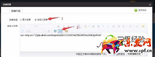店鋪招牌裝修:鼠標(biāo)放到店鋪招牌板塊中,此時(shí)可以看到“編輯”按鈕,點(diǎn)擊“編輯”,然后點(diǎn)擊“自定義招牌”,再點(diǎn)擊代碼按鈕,把上傳到圖片空間中的圖片地址復(fù)制到編輯框中。