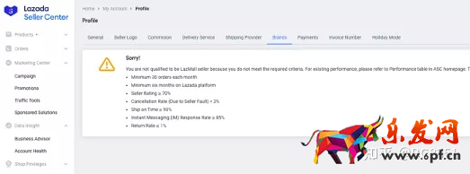 2.如果您點擊“Brand ”出現(xiàn)以下頁面,則表示你的賬戶表現(xiàn)暫時不符合入駐Lazmall.