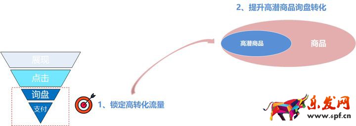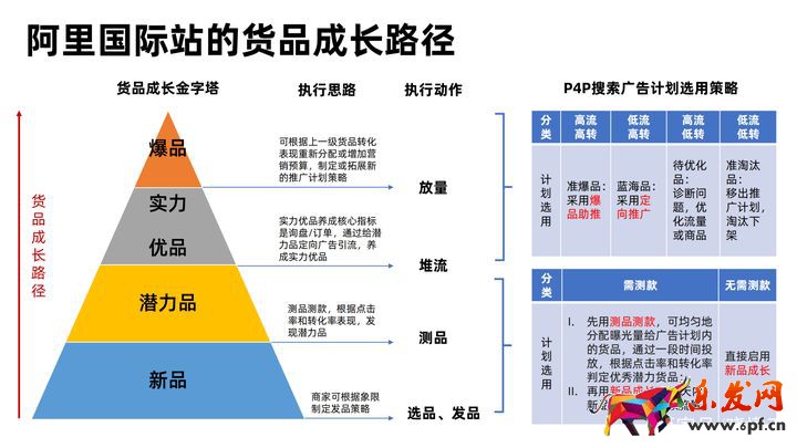 廣告投放策略的核心就是用好P2=Pull·Push模型。其實這個模型對應就是上面提到的2大交易場景和流量的匹配方式。Pull=搜索廣告-人找貨-被動搜索,Push=推薦廣告-貨找人-主動推廣。一定要確保同時使用這2種廣告,搜索廣告這塊我就不必強調了,這個基本上是商家一定會使用的廣告。這里重點要強調的是為什么推薦廣告一定也要去做,一方面是貨找人的匹配交易比重在逐年提高,另一方面就是阿里對任何廣告都會有個Push二次營銷的動作。舉個例子你投放了搜索廣告,正常就是按照下圖最上面Pull的路徑過來,如果客戶沒有轉化,阿里就會進入Push的鏈路對客戶營銷,但是因為你沒有投放推薦廣告,你的產(chǎn)品就沒辦法顯示該區(qū)域。如果客戶這時候被轉化,那么你單獨使用的搜索廣告的第一次營銷就是替別人做嫁衣裳了。這就是為什么我們需要同時開啟推薦廣告,通過二次營銷,或者更多頻次的營銷,提高客戶轉化,從而提升整體的投放效果。